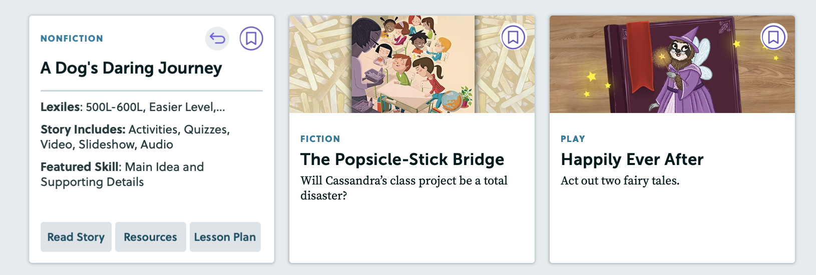 Story cards for every article flip over when you’re logged in as a teacher. On the back, you’ll quickly see the Lexile level of each story and an overview of the resources available for you to use. You can click the buttons on any of these story cards to go directly to read the individual article, see your support resources, and check out the lesson plan. You’ll also see a bookmark icon if you want to save the story and go back to it later in the year.
